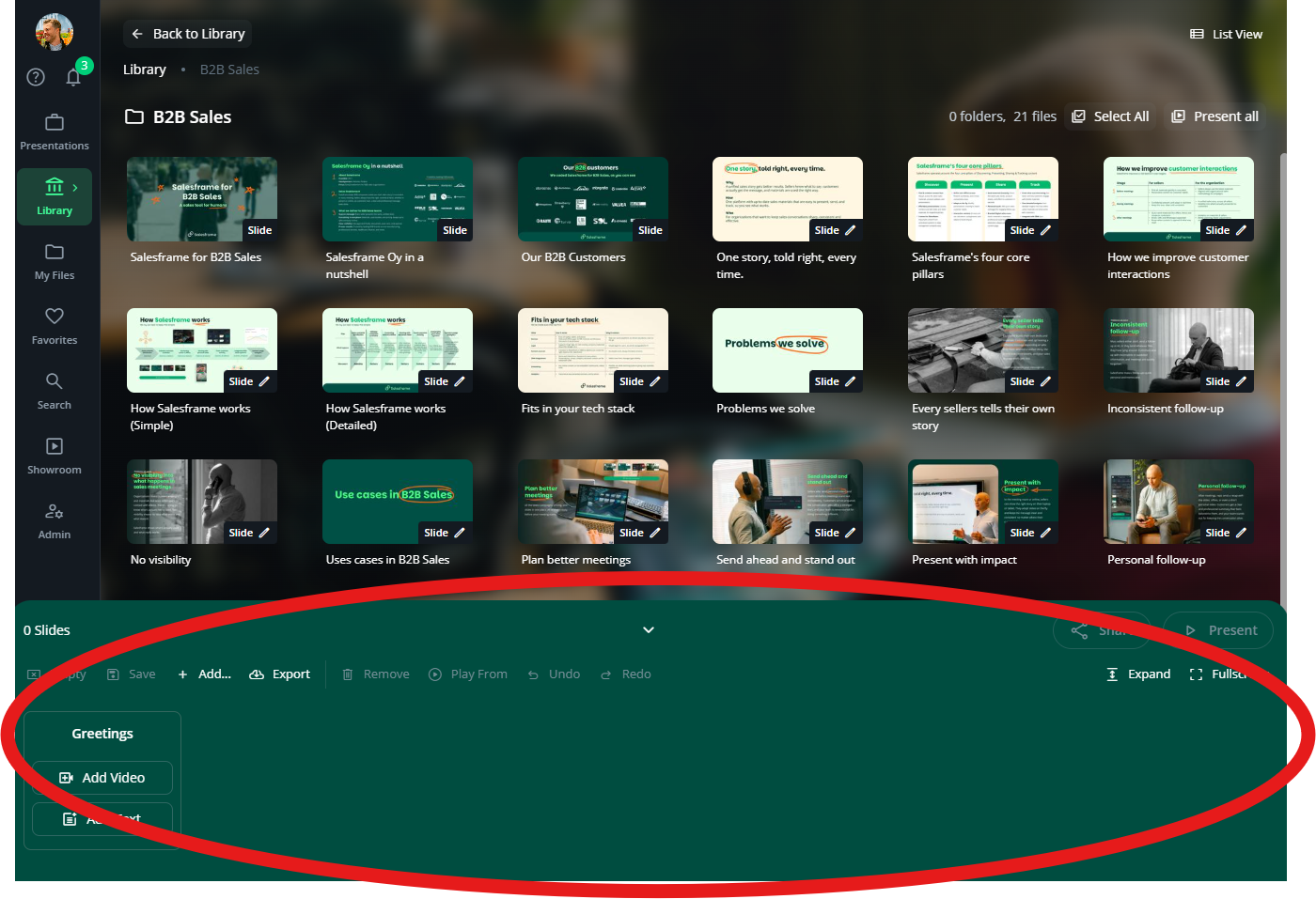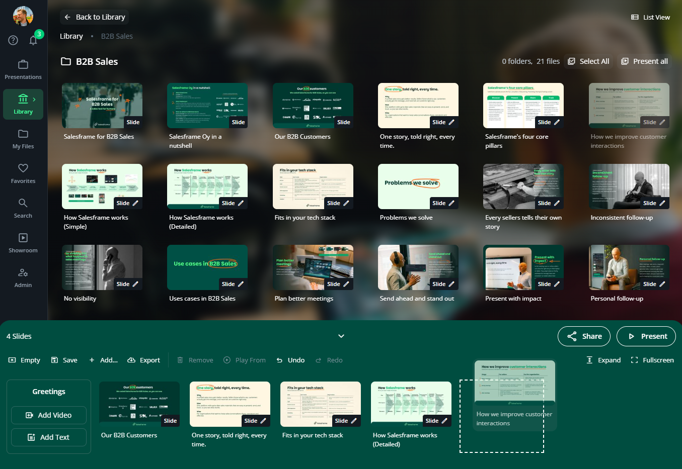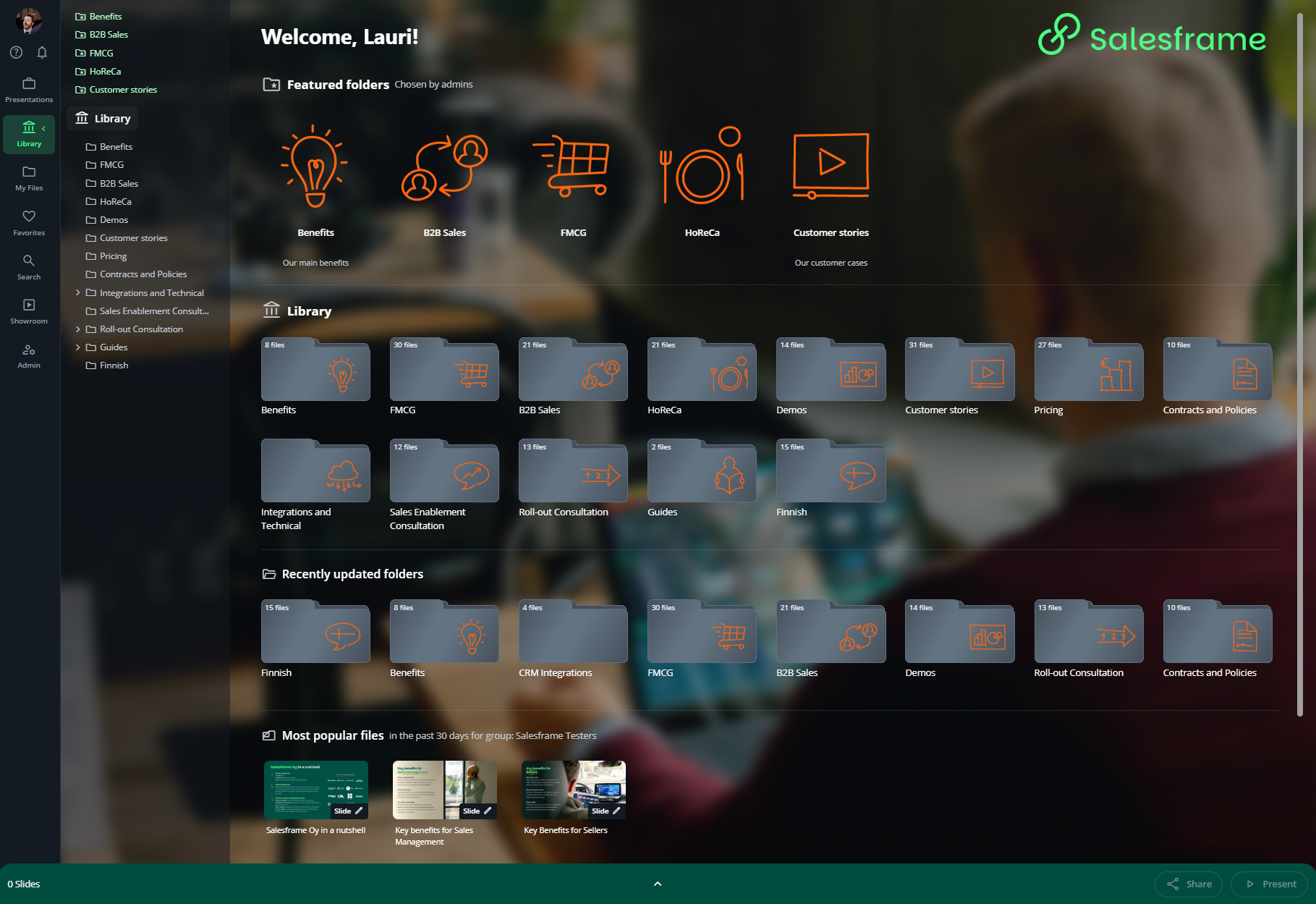 When you open Salesframe, you land in Library. This is the home for all sales content your admins have prepared for you. Here are the three main ways to find admin-curated content in Salesframe:
