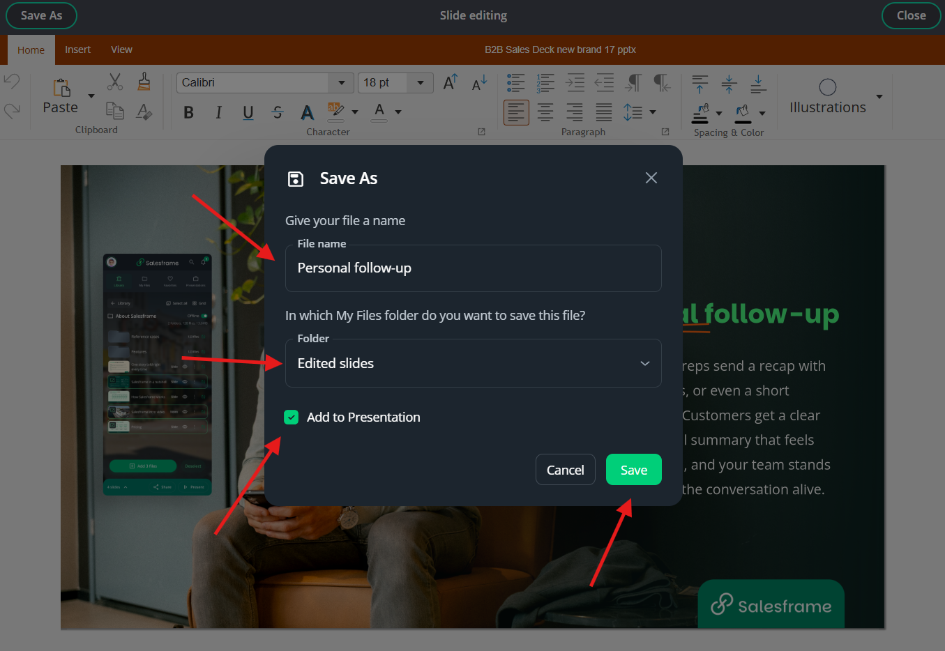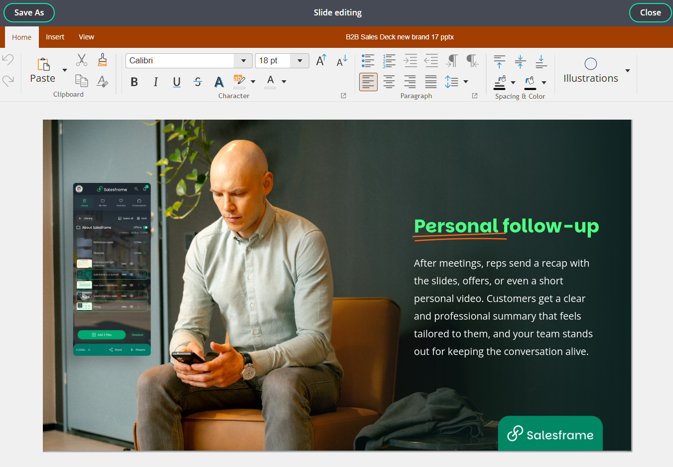 Depending on permissions set by your admins, some slides and files can be edited directly in Salesframe.