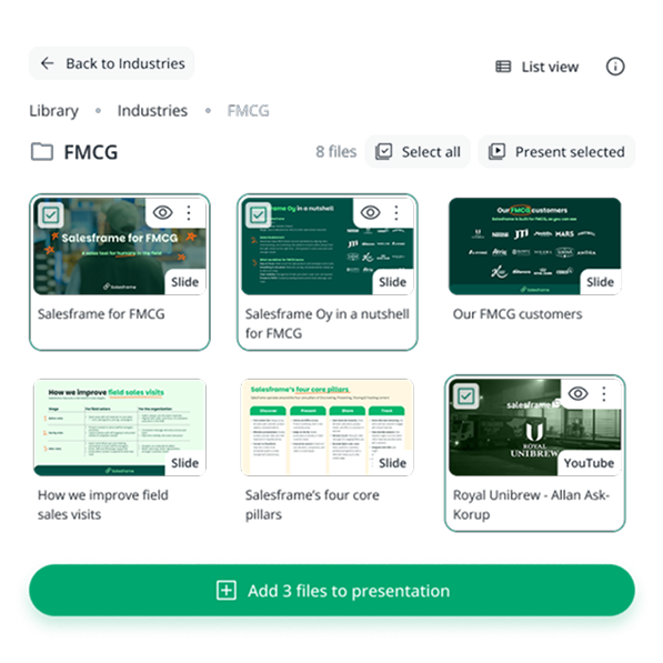 With Salesframe, you can find, build, edit, and personalize presentations in one place using ready made content like slides and videos. That means more time for calls and effortless control over creating unique, engaging pitches.